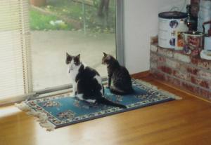 The first few days we tried to keep her sequestered in my daughter’s bedroom. The vet advised us that we should let her get near the other cat for a few days. At the time the resident feline was Mr. Worf, a rather large Manx, 5 years her senior. For the first day she sat in the corner and meowed piteously, stopping only long enough to eat, drink and sleep. Seems that Mr. Worf was concerned about Missey; he knew how to rattle the doorknob while leaning on the door, opening it up. I was reading the paper and noticed that the house grew quiet. I was surprised to see the room opened and Worf sitting on the bed, Missey sound asleep leaning against his side. We didn’t have anything to