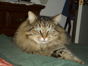 The Big Guy has started to loose some of the golden mane he grew for the winter. It’s still quite full but he’s lost some of the fur on the bottom of his neck. The young female coon has lost some of hers, as well. While these two have left a few clumps of fur on the carpet (and anywhere else they happen to be), the real problem is with the other Maine Coon. He’s started to leave piles of fur everywhere. We’re not talking about a few hairs here and there; we’re talking about clumps of fur. I’ve probably vacuumed up enough fur in the last week to spin yarn for a sweater, a XXL cable knit sweater.