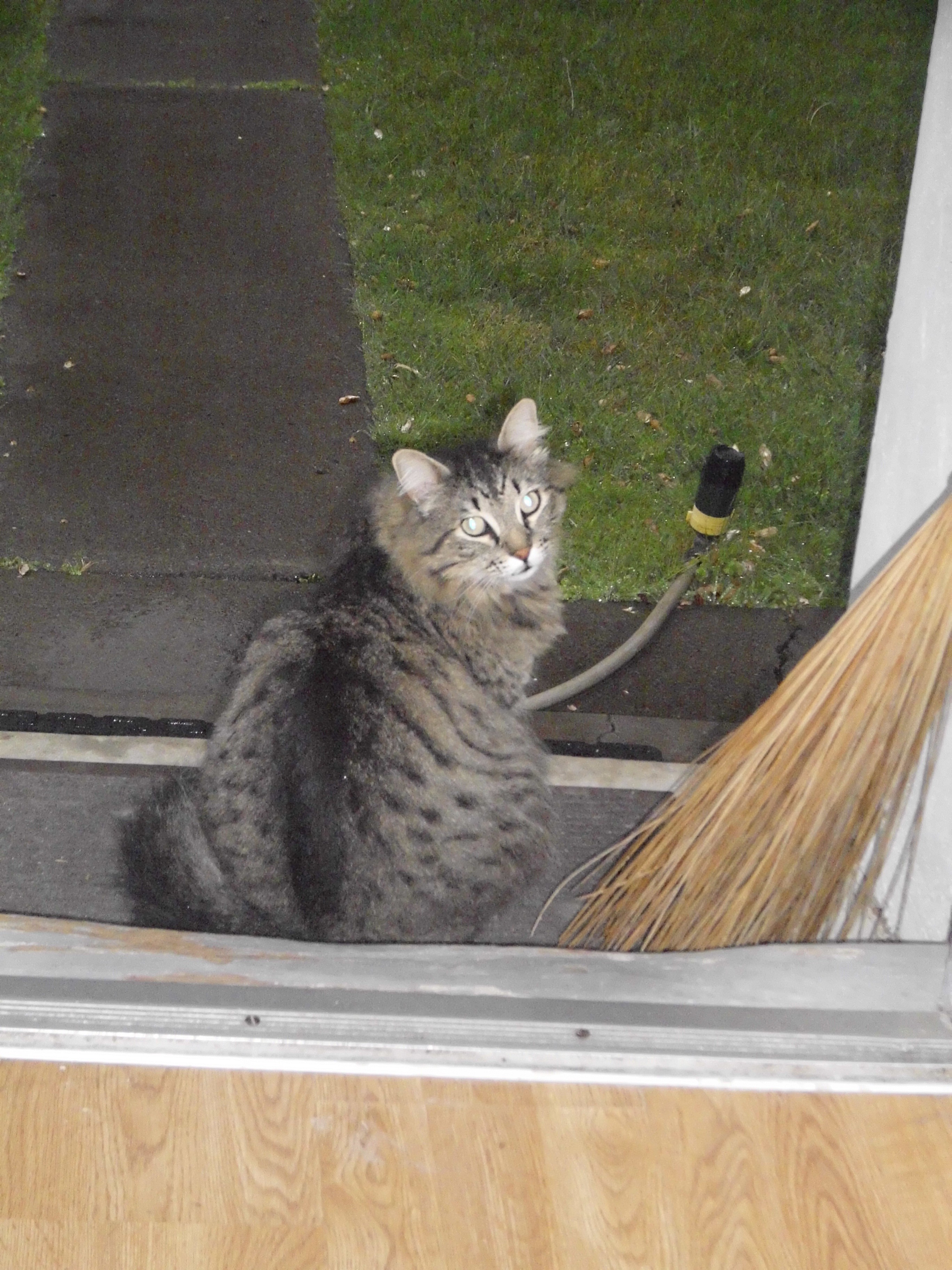 As can be seen in the picture, the Big Guy wasn’t particularly happy. I took the pictures around 4:00 in the afternoon, when he usually goes out on the afternoon patrol. He sat there at the back door for a hour, waiting for the rain to let up; he needed to be out there but wasn’t too excited about getting soaked.
