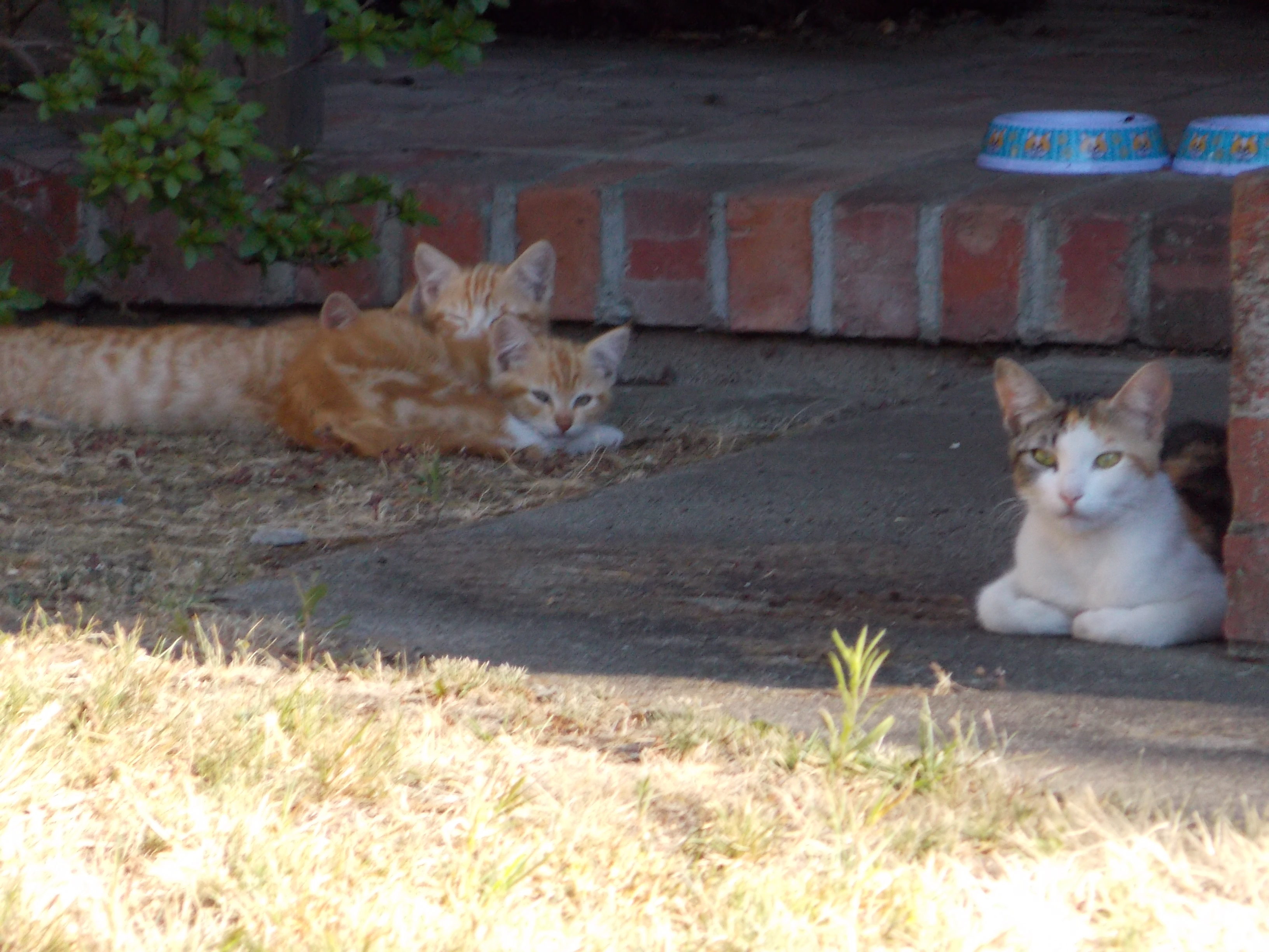 Acceptance by the Court Cats. The regular inhabitants haven’t chased the kitties off yet. Some of the locals don’t seem to mind while others find them to be an irritant. Precious (the old lady) lays out on the back steps and yells at any of the kitties who come near. (She yells at everyone who comes near). Mr Big hangs out with the mommy cat and the kitties. In the evening he’ll be found by the food dish, waiting for them to come by. In the late afternoons he’ll be sleeping out under a bush with 2 or 3 of the furballs tucked in beside him.