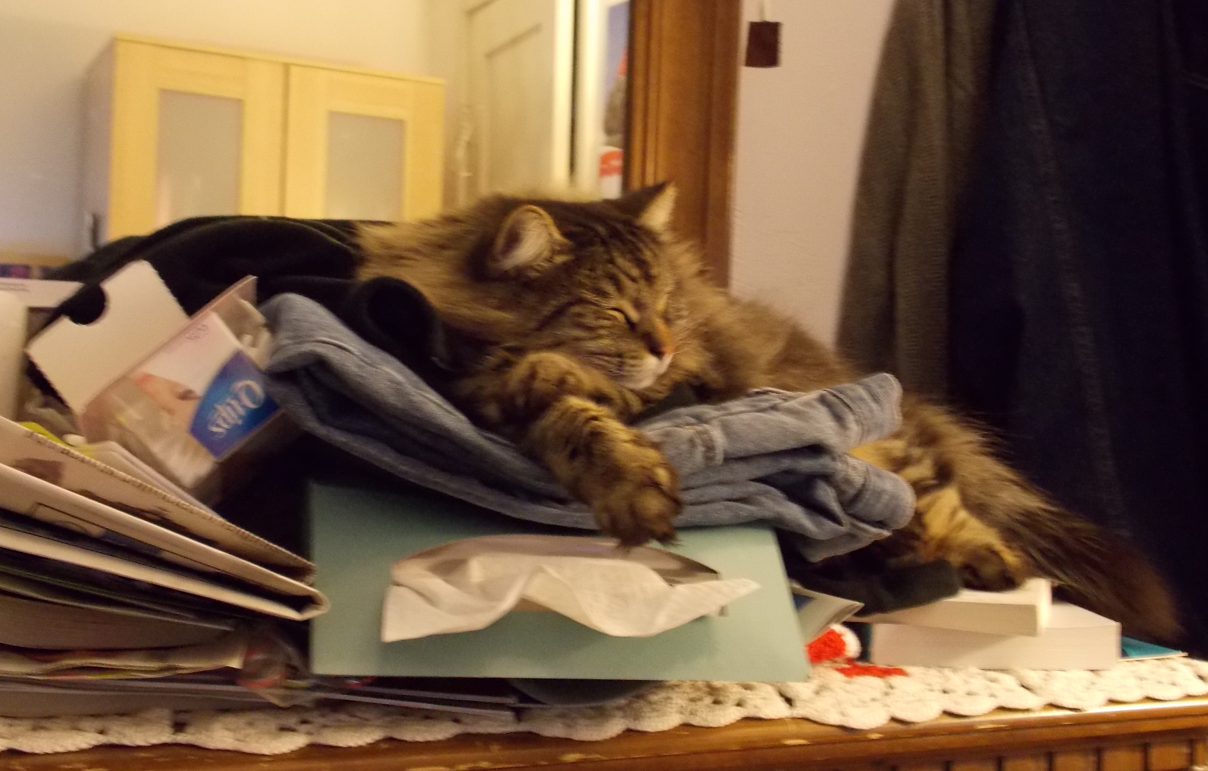 I’ve often wondered how well the cats hear. Googling ‘cat hearing’ I have learned that cats can hear sounds at 64 kHz, nearly 1.6 octaves higher than we humans; a full octave higher than dogs hear. How accurate is their hearing? At a distance of 91 cm their ears can focus the hearing on an object to within 70 mm. (So that’s how the Big Guy can track the occasional spider that dares challenge him on his turf.)